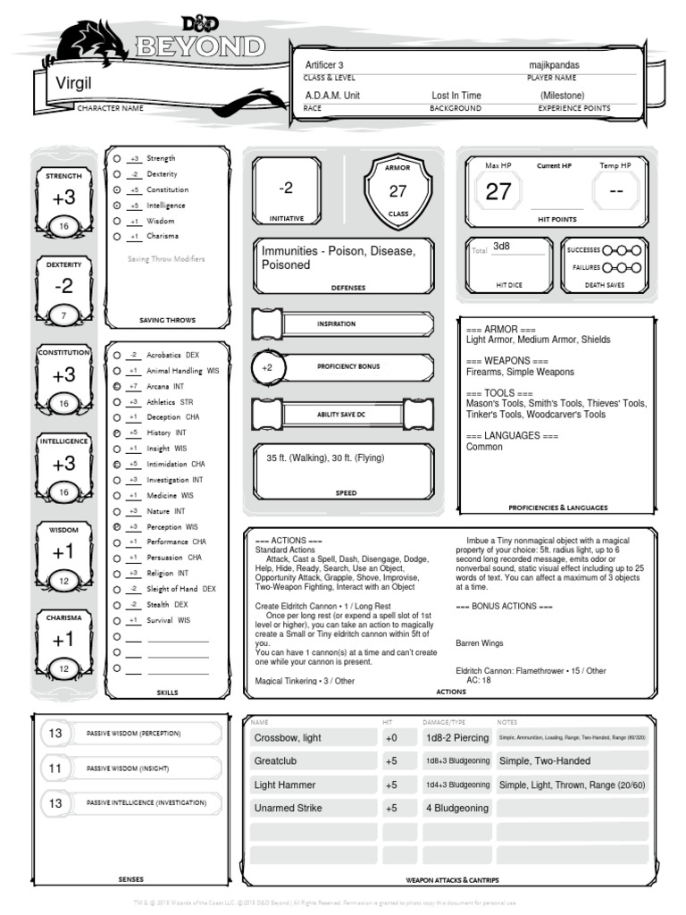 D&D Character Sheet: Artificer A.D.A.M. Unit