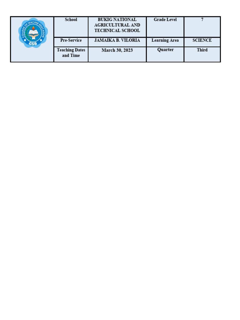 Pre-Service JAMAIKA B. VILORIA Learning Area SCIENCE