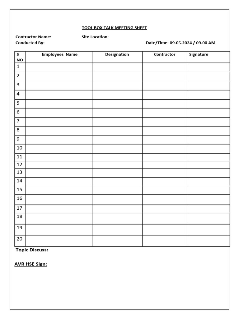 Toolbox Talk Meeting Sheet Template