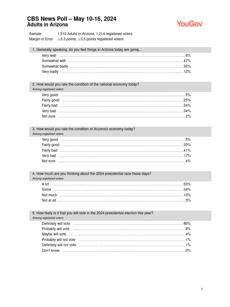 The CBS News/YouGov survey of 1,510 adults living in Arizona was conducted between May
