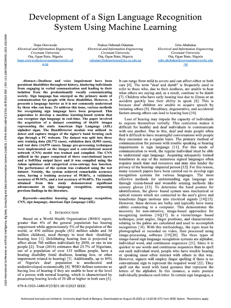 can recognize sign language in real-time. The paper involved Loss of hearing may impede the capacity of individuals