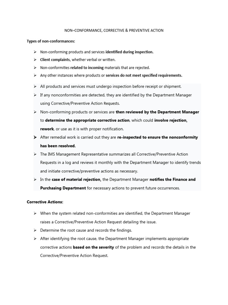 NON–CONFORMANCE, CORRECTIVE & PREVENTIVE ACTION