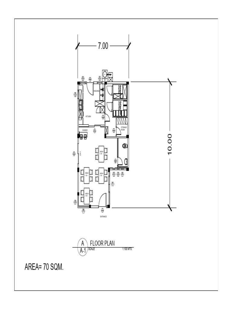 The document contains a floor plan of a kitchen area with designated sections for washing, storage, and cashier. The total area of the kitchen is 70 square meters, and the scale of the plan is 1:100 meters. Various dimensions are provided, indicating specific areas within the layout.