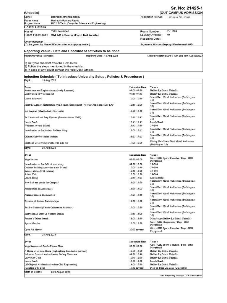 Reporting Venue : (Unipolis) Reporting Date : 14 Aug 2023 Allotted Reporting Date : 17th and 18th August 2023