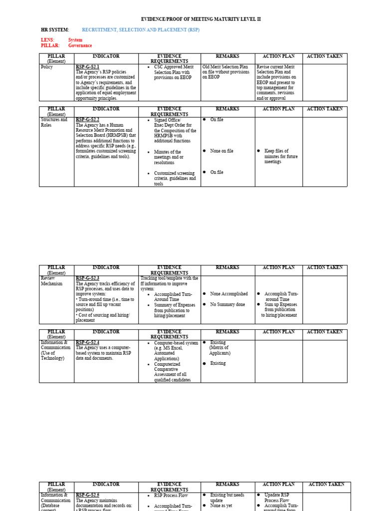 PILLAR INDICATOR EVIDENCE REQUIREMENTS REMARKS ACTION PLAN ACTION TAKEN
