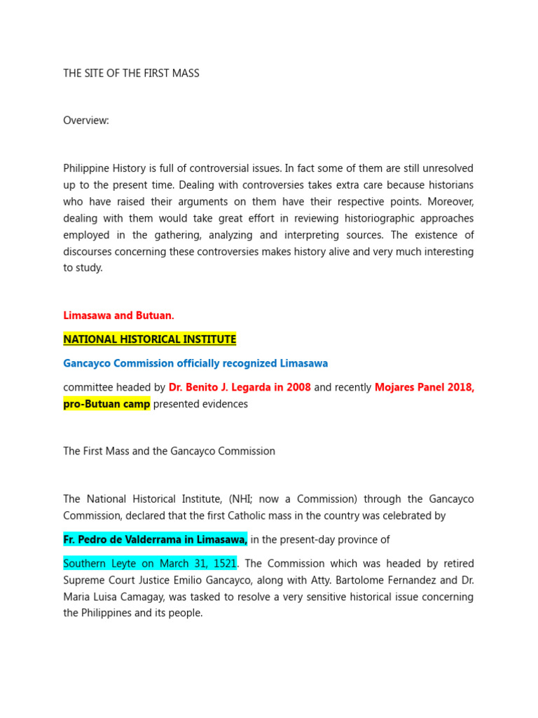 1. Pigafetta's account, translated by James Robertson, indicates Limasawa as the site of the First