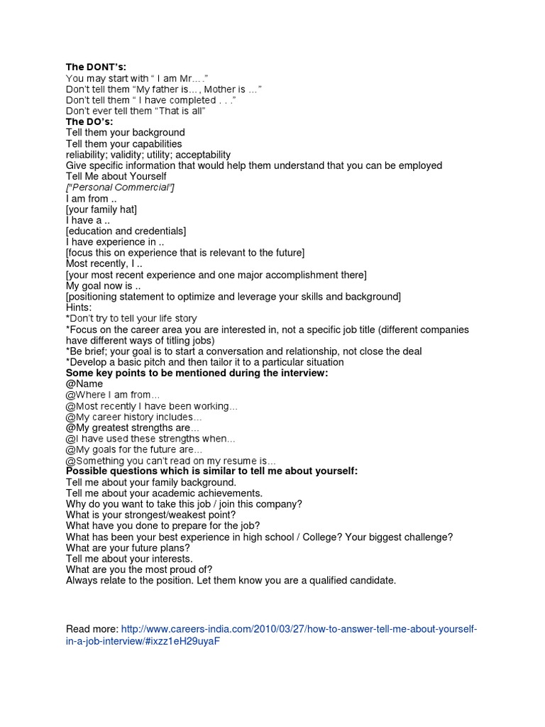 Read more: http://www.careers-india.com/2010/03/27/how-to-answer-tell-me-about-yourselfin-a-job-interview/#ixzz1eH29uyaF