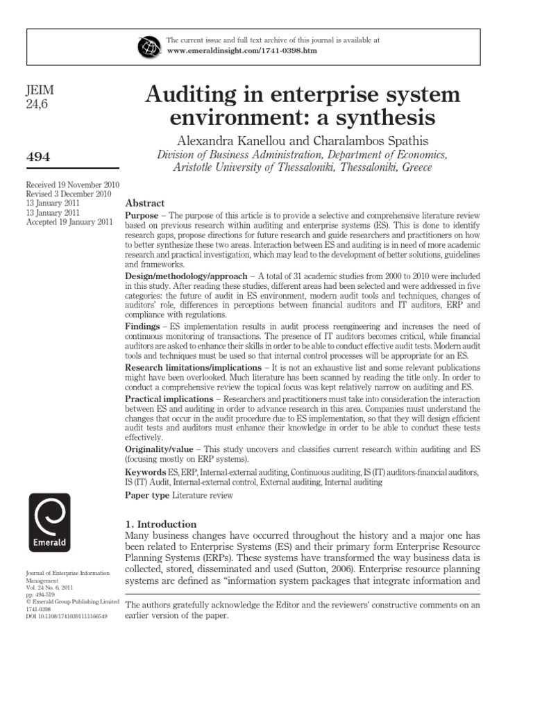 research gaps, propose directions for future research and guide researchers and practitioners on how to better synthesize these two areas. Interaction between ES and auditing is in need of more academic research and practical investigation, which may lead to the development of better solutions, guidelines and frameworks. Design/methodology/approach A total of 31 academic studies from 2000 to 2010 were included in this study. After reading these studies, different areas had been selected and were addressed in ve categories: the future of audit in ES environment, modern audit tools and techniques, changes of auditors role, differences in perceptions between nancial auditors and IT auditors, ERP and compliance with regulations. Findings ES implementation results in audit process reengineering and increases the need of continuous monitoring of transactions. The presence of IT auditors becomes critical, while nancial auditors are asked to enhance their skills in order to be able to conduct effective audit tests. Modern audit tools and techniques must be used so that internal control processes will be appropriate for an ES. Research limitations/implications It is not an exhaustive list and some relevant publications might have been overlooked. Much literature has been scanned by reading the title only. In order to conduct a comprehensive review the topical focus was kept relatively narrow on auditing and ES. Practical implications Researchers and practitioners must take into consideration the interaction between ES and auditing in order to advance research in this area. Companies must understand the changes that occur in the audit procedure due to ES implementation, so that they will design efcient audit tests and auditors must enhance their knowledge in order to be able to conduct these tests effectively. Originality/value This study uncovers and classies current research within auditing and ES (focusing mostly on ERP systems). Keywords ES, ERP, Internal-external auditing, Continuous auditing, IS (IT) auditors-nancial auditors, IS (IT) Audit, Internal-external control, External auditing, Internal auditing Paper type Literature review