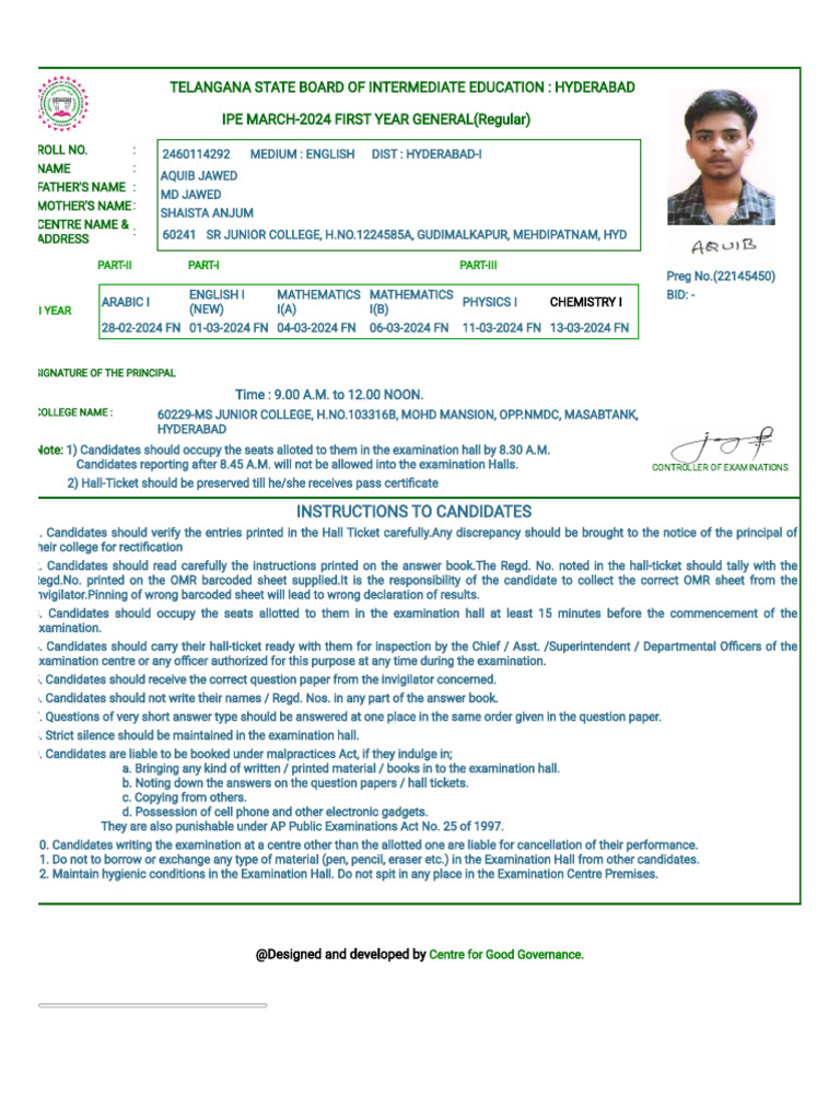 . Candidates should verify the entries printed in the Hall Ticket carefully.Any discrepancy should be brought to the notice of the principal of
