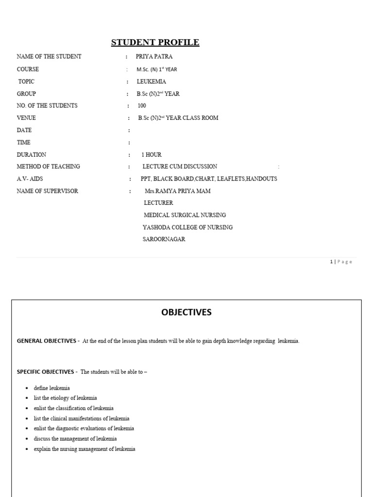 GENERAL OBJECTIVES - At the end of the lesson plan students will be able to gain depth knowledge regarding leukemia.
