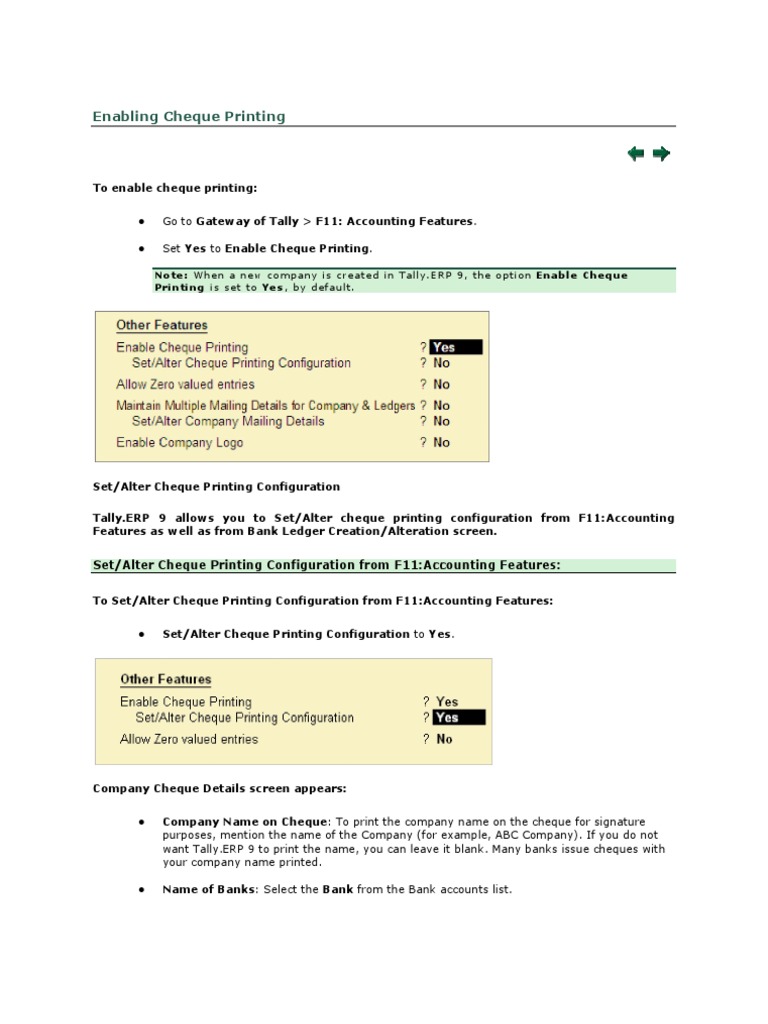 Set/Alter Cheque Printing Configuration Tally.ERP 9 allows you to Set/Alter cheque printing configuration from F11:Accounting Features as well as from Bank Ledger Creation/Alteration screen.