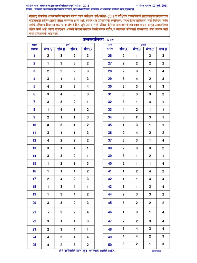 महारा टर् लोकसेवा आयोगामाफर्त सहायक मोटार वाहन िनरीक्षक (पूवर्) परीक्षा - 2011 या परीक्षे च्या नपितर्केची उत्तरतािलका उमे दवारांच्या