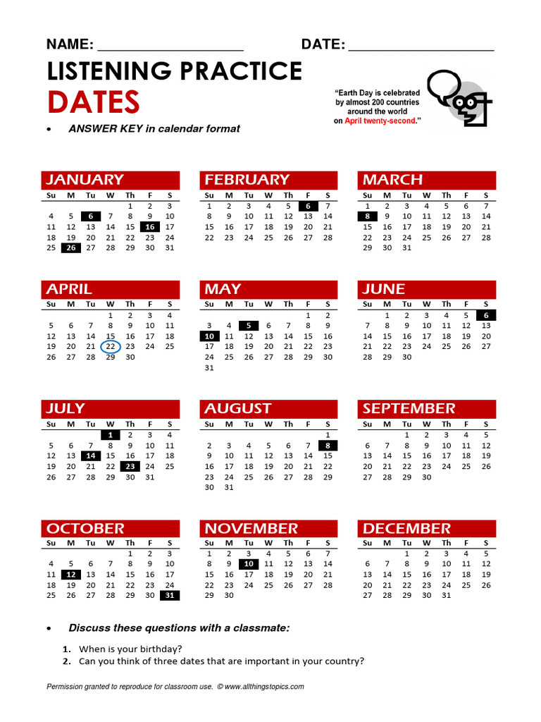 down the dates they heard. For example: (1) April 22 / (2) May 5 / etc. Answers will likely