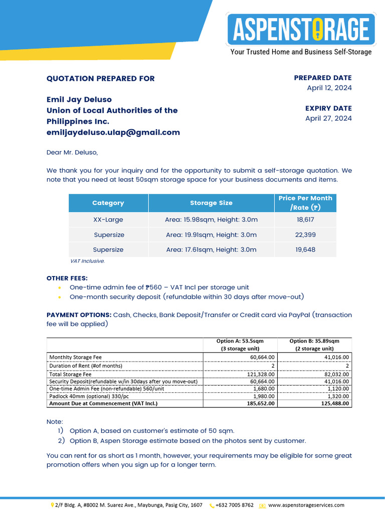 We thank you for your inquiry and for the opportunity to submit a self-storage quotation. We