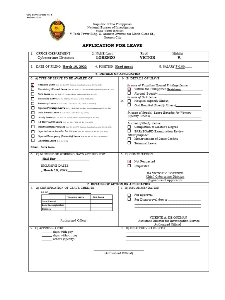 3. DATE OF FILING March 10, 2022 4. POSITION Head Agent 5. SALARY P 0.00_____