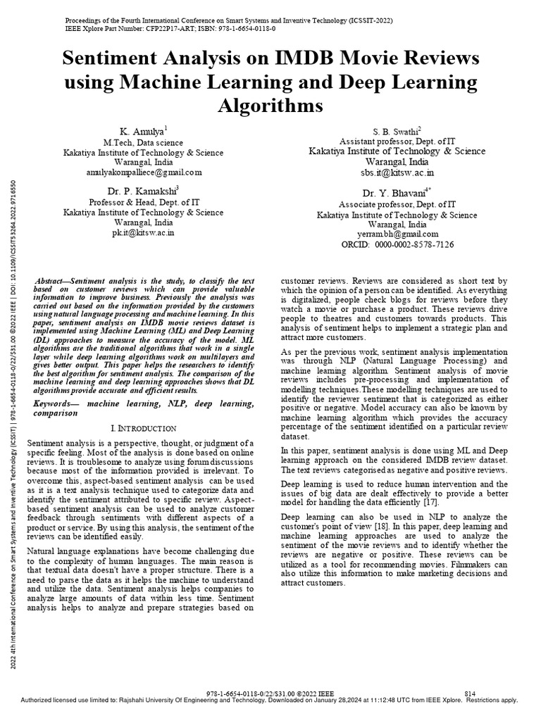 specific feeling. Most of the analysis is done based on online In this paper, sentiment analysis is done using ML and Deep