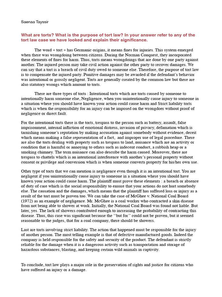 What are torts? What is the purpose of tort law? In your answer refer to any of the