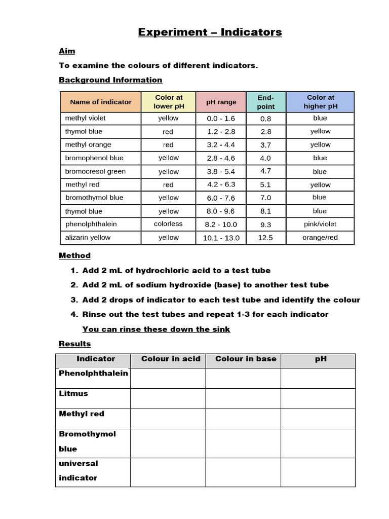 4. Rinse out the test tubes and repeat 1-3 for each indicator