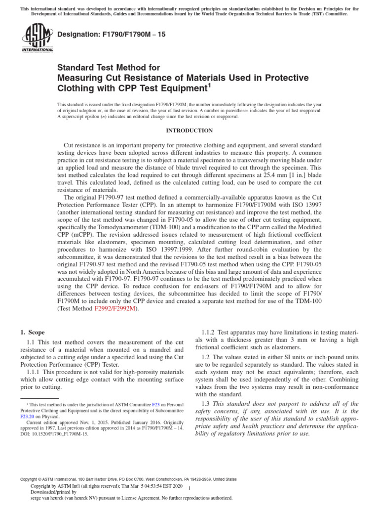 ISO 13997 Protective Clothing—Mechanical Properties— clothing are defined in Terminology F1494.