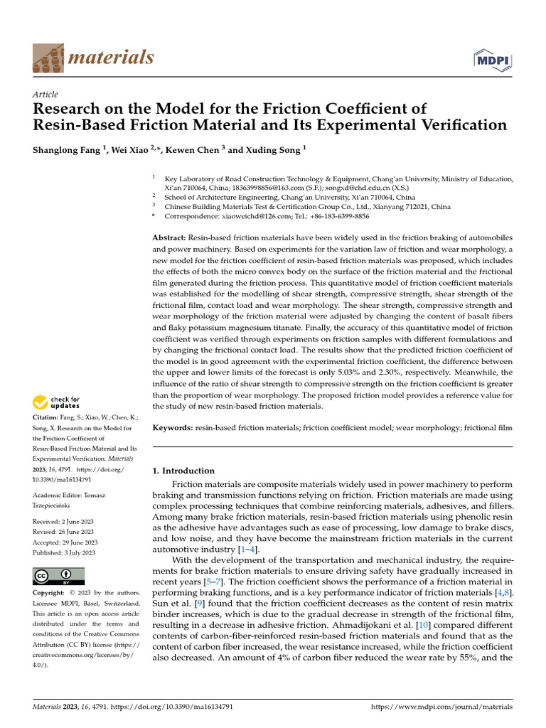 Song, X. Research on the Model for Keywords: resin-based friction materials; friction coefficient model; wear morphology; frictional film
