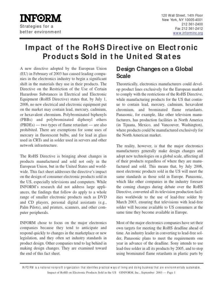 Impact of RoHS on Electronic Products Sold in the US INFORM, Inc., September 2003 Page 1