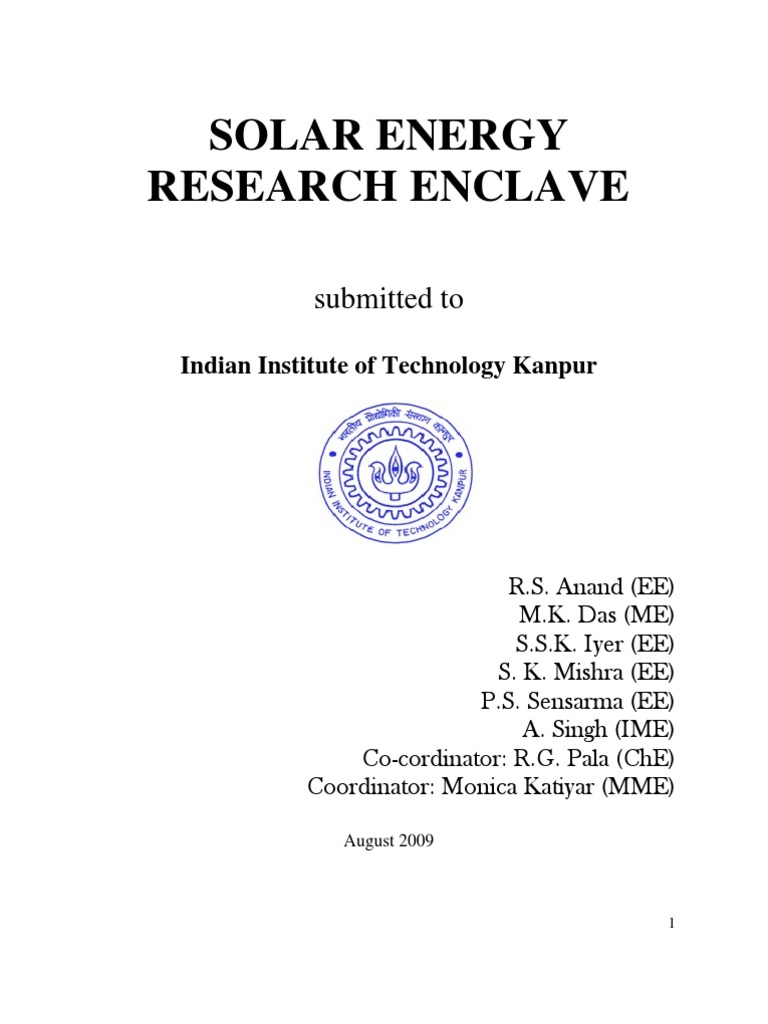 several initiatives are being planned. On 30th June 2008 the Prime minister of India, Dr. Manmohan Singh, announced the National Plan for Climate Change.1 This includes a National Solar Mission to significantly increase the share of solar energy in the total energy resources while recognizing the need to expand the scope of other renewable and non-fossil options such as nuclear energy, wind energy, and biomass. The departments of Science and Technology (DST) and the ministry for New and Renewable Energy (MNRE) have taken initiatives to promote formation of networks of premier research institutes to work on solar power generation related projects. One such scheme is DSTs Pan-IIT Solar Energy Initiative (PSI) with a goal of delivering a 1MW solar based islanded energy grid in 5yrs. A multi-disciplinary team from four departments of IIT Kanpur has been participating in this initiative. To further strengthen the contribution to the National Solar Mission and the PSI, it is felt that a broader inter disciplinary group can be formed at the institute level aiming to develop short and long term technology in the area of power electronics component and system design, solar energy materials, supplementary energy storage and conversion devices. An establishment of Solar Energy Research Enclave will catalyze the accomplishing of this goal of national importance, and this is the genesis of this proposal for Solar Energy Research Enclave (SERE). 2.1. Objective of project The primary objective of the solar energy research enclave will be two-fold a) Establishment of a solar power station that can supply 1MW 3 power b) Outline the research areas that will be explored for sustainable solar energy generation, storage and distribution. The solar power station will be built in modular fashion such that different technologies can be utilized/tested for generating power. The modules will be designed not only as a demonstrator of existing technologies but also to explore cutting edge research technologies that have potential for economic viability. The over view of the solar power station will be presented in Section 3. The various research projects that will be explored under the present initiative is presented in Section 4.
