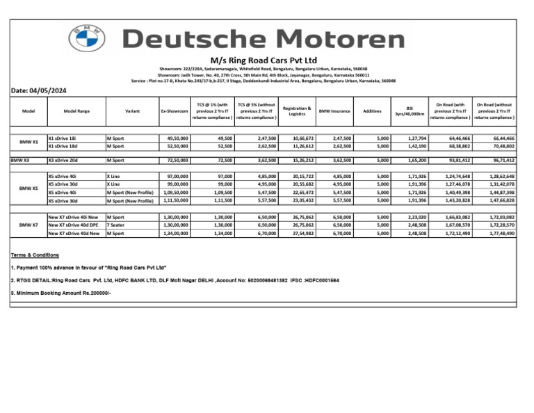 1. Payment 100% advance in favour of "Ring Road Cars Pvt Ltd"
