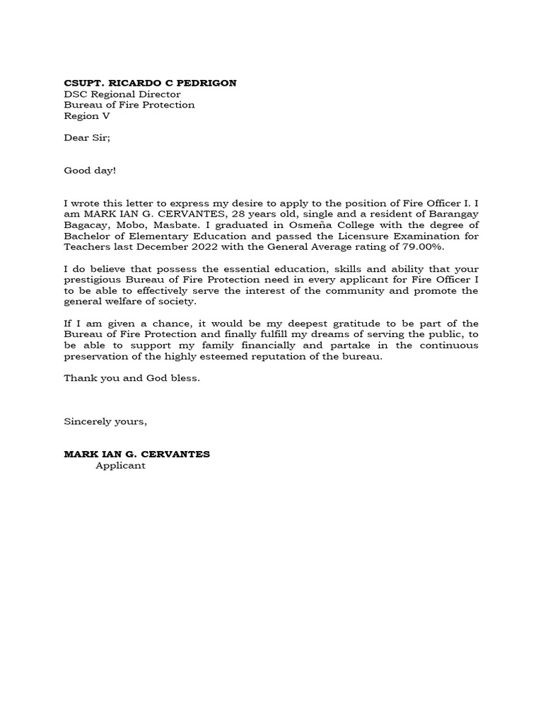 I wrote this letter to express my desire to apply to the position of Fire Officer I. I