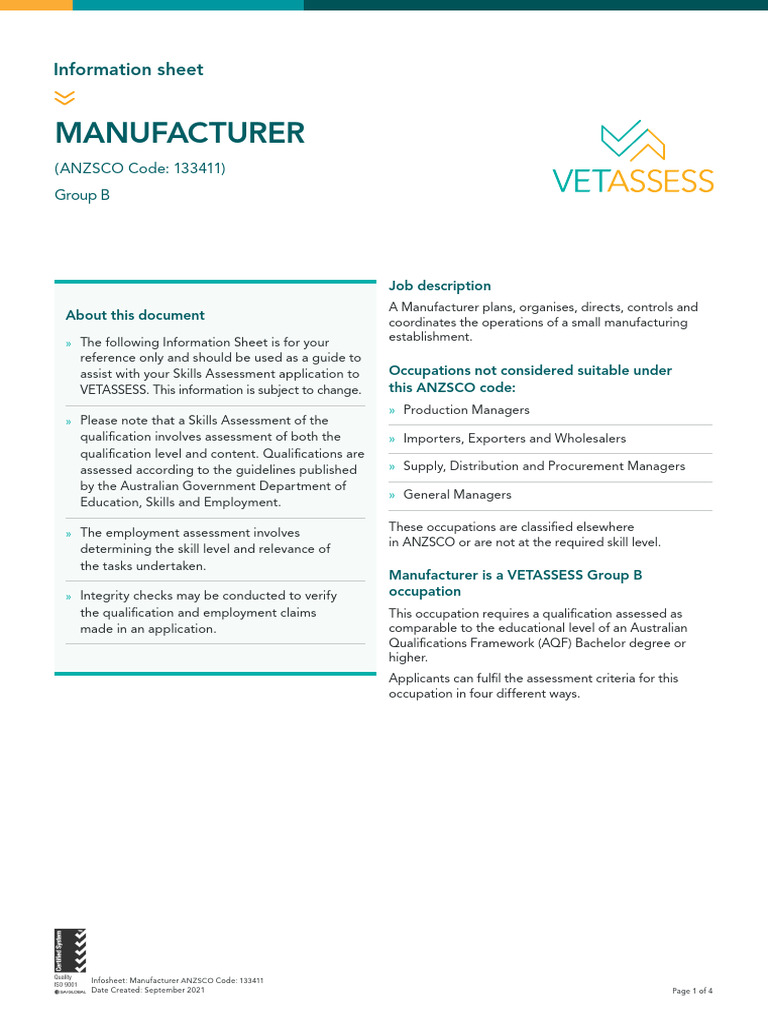 Infosheet: Manufacturer ANZSCO Code: 133411