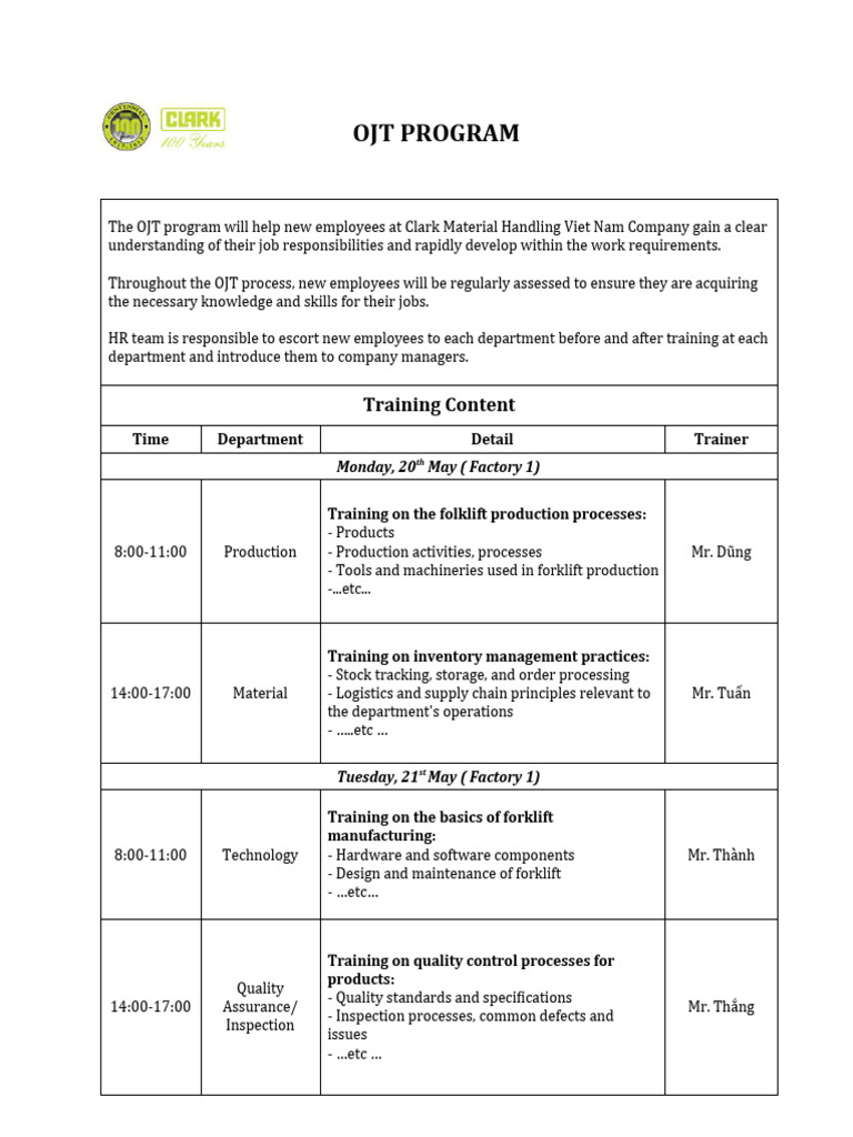 The OJT program will help new employees at Clark Material Handling Viet Nam Company gain a clear