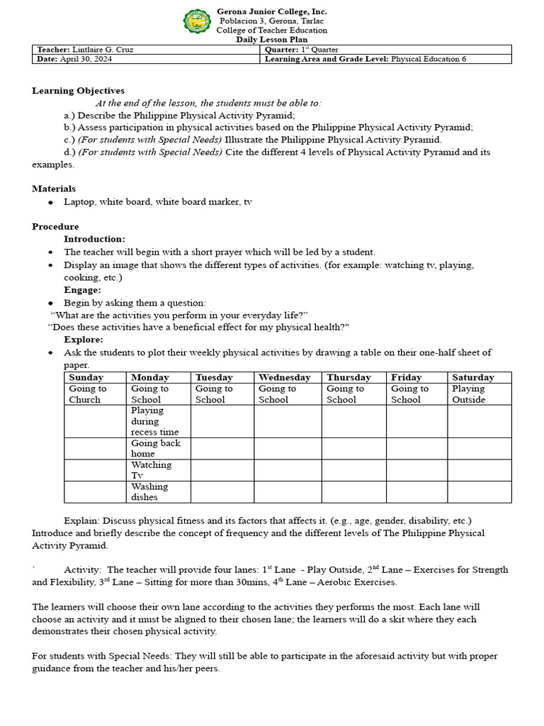 Date: April 30, 2024 Learning Area and Grade Level: Physical Education 6