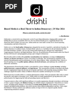 danger to the conduct of free and fair elections. It was suggested that the powers that are vested in returning officers appointed by the Election Commission before the elections take place are adequate for such officers to issue notices to the press to explain the basis of particular news reports and ascertain whether financial transactions had actually taken place between candidates and representatives of media companies. In recent years, corruption in the Indian media has gone way beyond the corruption of individual journalists and specific media organizations -- from planting information and views in lieu of favours received in cash or kind, to more institutionalized and organized forms of corruption wherein newspapers and television channels receive funds for publishing or broadcasting information in favour of particular individuals, corporate entities, representatives of political parties and candidates contesting elections, that is Sought to be disguised as paid news. News is meant to be objective, fair and neutral this is what sets apart such information and opinion from advertisements that are paid for by corporate entities, governments, organizations or individuals. What happens when the distinction between news and advertisements start blurring, when advertisements double up as news that have been paid for, or when news is published in favour of a particular politician by selling editorial spaces? In such situations, the reader or the viewer can hardly distinguish between news reports and advertorials. Over the last few years and since 2009 in particular, the phenomenon of paid news has acquired a new and even more pernicious dimension by entering the sphere of political news or reporting on candidates contesting elections. Numerous favourable or complimentary news reports and feature articles on representatives of political parties, including candidates who have been contesting elections, have appeared in newspapers across the country in the run-up to the Lok Sabha as well as state legislative assembly elections and similar kinds of information have been aired on television channels without disclosing the fact that monetary transactions have taken place between the concerned candidate or political party to which he or she belongs and the owners or representatives of particular media organizations. The entire operation is clandestine. This malpractice has become widespread and now cuts across newspapers and television channels, small and large, in different languages and located in various parts of the country. What is worse, these illegal operations have become organized and involve advertising agencies and public relations firms, besides journalists, managers and owners of media companies. Marketing executives use the services of journalists willingly or otherwise to gain access to political personalities. So-called rate cards or packages are distributed that often include rates for publication of news items that not merely praise particular candidates but also criticize their political opponents. Candidates who do not go along with such extortionist practices on the part of media organizations are denied coverage. Renowned journalist, the late Shri Prabhash Joshi spoke extensively in public about paid news. The Rural Affairs Editor of The Hindu Shri P. Sainath has written a series of articles on the phenomenon, many of which have highlighted the manner in which the
