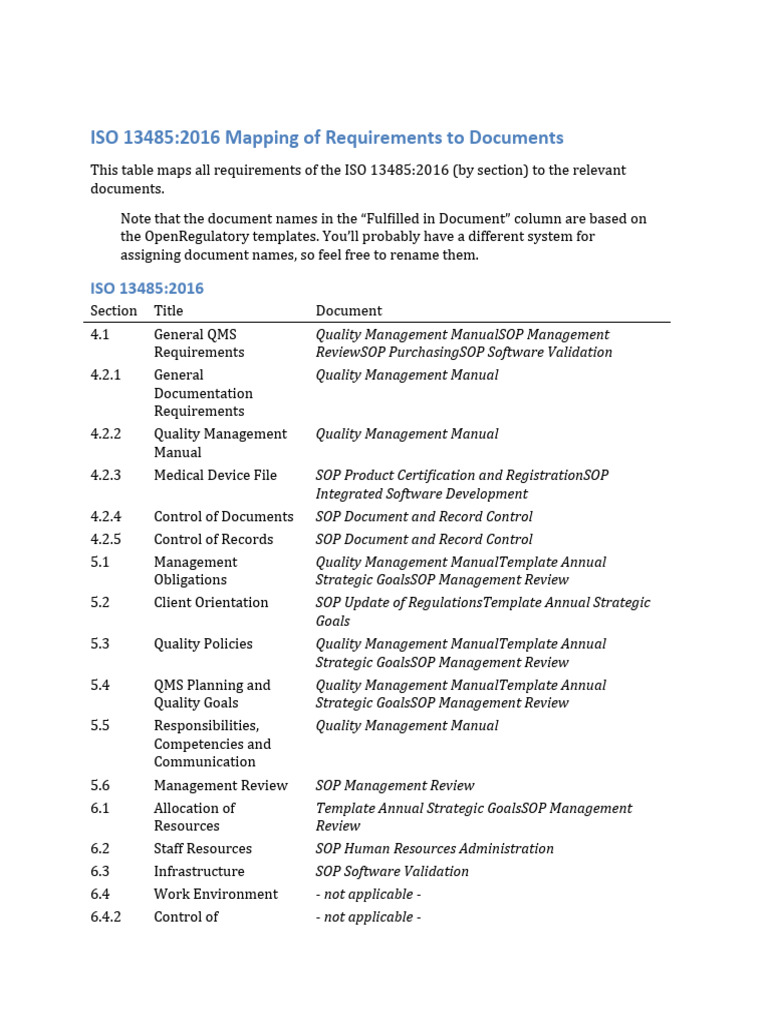 ISO 13485:2016 Mapping of Requirements to Documents