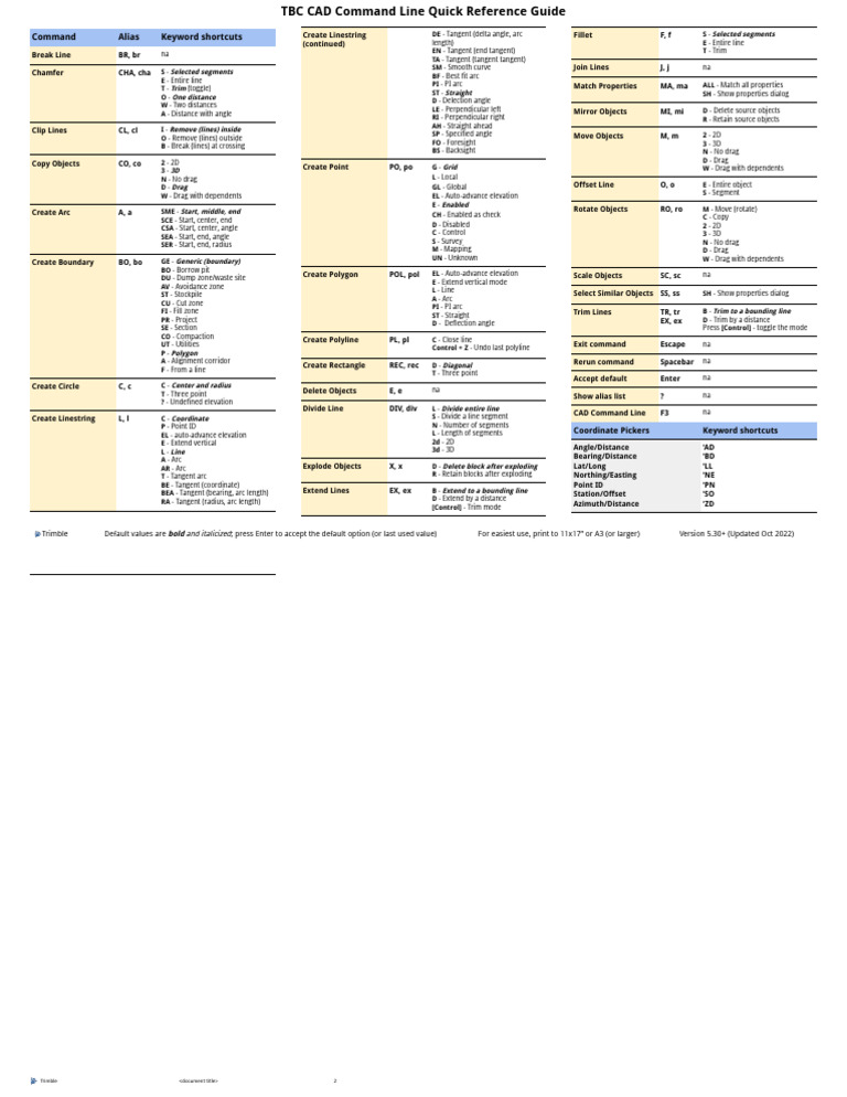 Trimble Default values are bold and italicized; press Enter to accept the default option (or last used value) For easiest use, print to 11x17” or A3 (or larger) Version 5.30+ (Updated Oct 2022)
