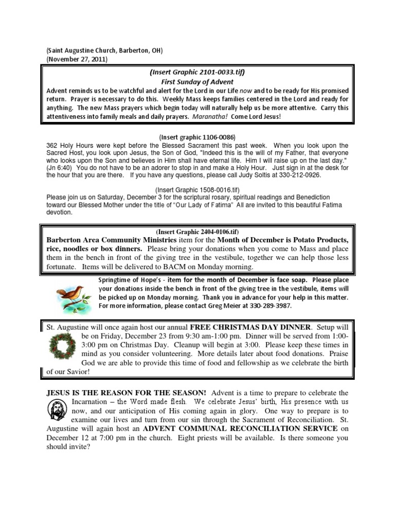(Insert Graphic 1201-0055.tif) THE ADULT SERVERS MINISTRY needs one additional team of 4 servers plus one server for an existing team. Are there five members of our parish who would like to help this Ministry? Talk to your friends and form a team of four, or join the Ministry as one person to complete an existing team to serve once every four weeks at the 7:30 a.m. Sunday Mass. If this sounds interesting to you, please call Tom Logsdon (330-745-1373) and you will be added to the new schedule which begins in January 2012. On-the-job training is provided. Catholic Charities Community Service/Summit County Women's Board is having their annual "Bags of Love." The Women's Board helps out families in need that the Agency is working with especially at this time of year. You can send a donation to CCCS/SC Women's Board "Bag of Love" @812 Biruta St., Akron, Ohio 44307. Or if you would like to drop off items we could use any of the following, some laundry detergent, diapers, bar soap, dish detergent, toilet paper, paper napkins, paper towels, Kleenex, deodorant, shampoo/conditioners, toothpaste/toothbrushes/floss. Anything you are able to donate is so appreciated. We will be getting these items together at our December 9 meeting. God bless you and thank you for your help! Thank you for your contributions to the Collection for the Catholic Campaign for Human Development! Your generosity has laid the foundation for important changes in low-income communities all over the United States. Through CCHD, we manifest Catholic social teaching and carry out Jesus mission to bring good news to the poorrelease to captivessight to the blind and let the oppressed go free (Lk 4:18)