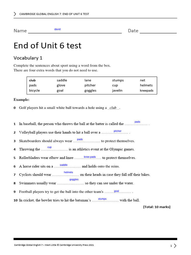 CAMBRIDGE GLOBAL ENGLISH 7: END OF UNIT 6 TEST