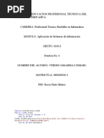 Me.Hide() Form4.show() End Sub Boton modificaciones: Private Sub Button6_Click(ByVal sender As System.Object, ByVal e As System.EventArgs) Handles Button6.Click Me.Hide() Form5.show() End Sub Boton ver todos los registros: Private Sub Button7_Click(ByVal sender As System.Object, ByVal e As System.EventArgs) Handles Button7.Click ver() End Sub Metodo ver: Private Sub ver() Dim ver As String = "SELECT * FROM Alumnos" Dim dataAdapter As New OleDb.OleDbDataAdapter(ver, cn) dataAdapter.Fill(dt) TextBox1.Text = CStr(dt.Rows(fila)("Matricula")) TextBox2.Text = CStr(dt.Rows(fila)("Nombre")) TextBox3.Text = CStr(dt.Rows(fila)("Paterno")) TextBox4.Text = CStr(dt.Rows(fila)("Materno")) TextBox5.Text = CStr(dt.Rows(fila)("Direccion")) TextBox6.Text = CStr(dt.Rows(fila)("Numgrupo")) dataAdapter.Dispose() End Sub Boton anterior: Private Sub Button1_Click(ByVal sender As System.Object, ByVal e As System.EventArgs) Handles Button1.Click If (fila > 0 And fila <= dt.Rows.Count - 1) Then fila = fila - 1 Actualiza() Else MsgBox("Primer Registro Encontrado", MsgBoxStyle.Information, "Mensaje") End If End Sub Boton siguiente: Private Sub Button2_Click(ByVal sender As System.Object, ByVal e As System.EventArgs) Handles Button2.Click If (fila >= 0 And fila < dt.Rows.Count - 1) Then fila = fila + 1 Actualiza() Else MsgBox("Ultimo Registro Encontrado", MsgBoxStyle.Information, "Mensaje") End If End Sub Boton regresar al menu principal: Private Sub Button8_Click(ByVal sender As System.Object, ByVal e As System.EventArgs) Handles Button8.Click Me.Hide() Form1.Show() End Sub Metodo refresca: Private Sub Refrescar() dt.Reset() fila = 0 Dim RefrescarDatos As String = "Select * from Alumnos" Dim dataAdapter As New OleDb.OleDbDataAdapter(RefrescarDatos, cn) dataAdapter.Fill(dt) Refrescar() dataAdapter.Dispose() End Sub Metodo actualiza: Private Sub Actualiza() TextBox1.Text = CStr(dt.Rows(fila)("Matricula"))