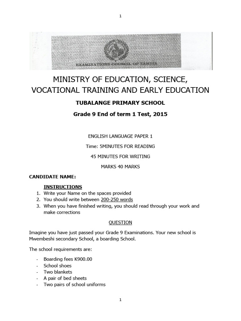 Grade 9 End of term 1 Test, 2015