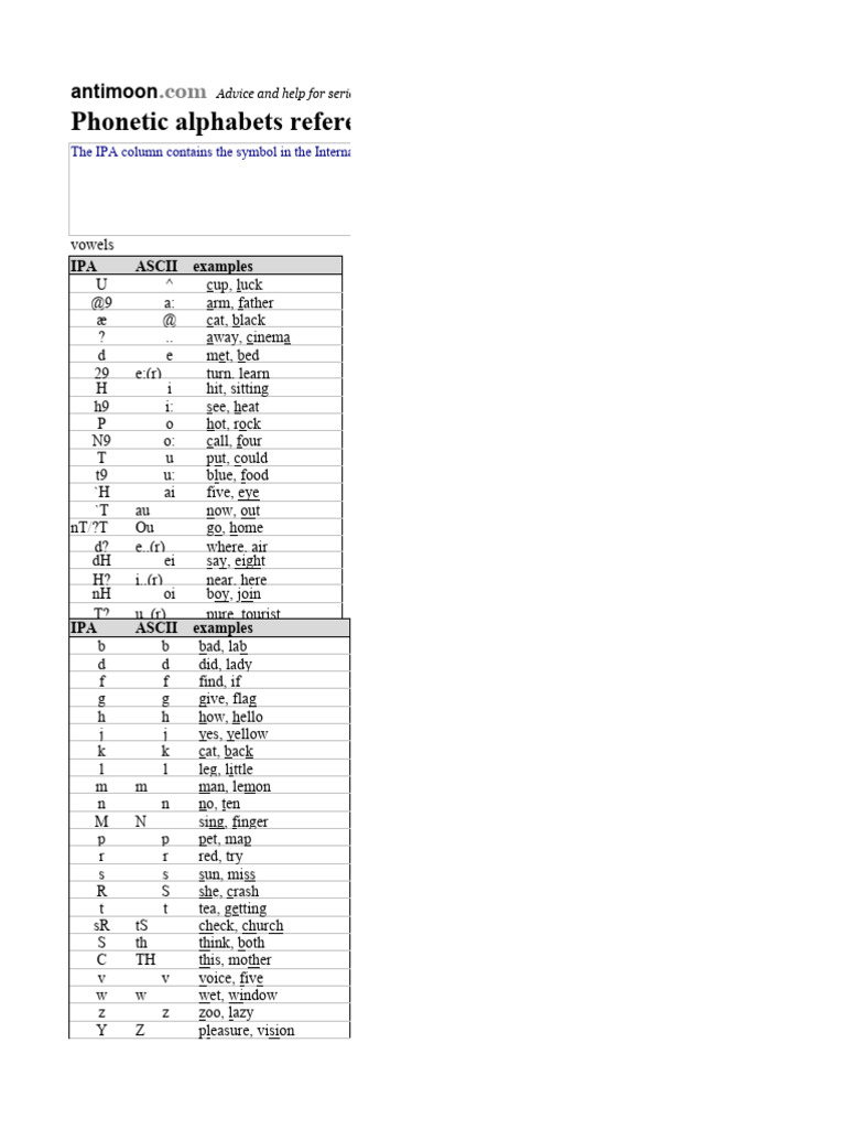 in the International Phonetic Alphabet, as used in phonemic transcriptions in modern English dictionaries.The ASCII column shows the corresponding sy