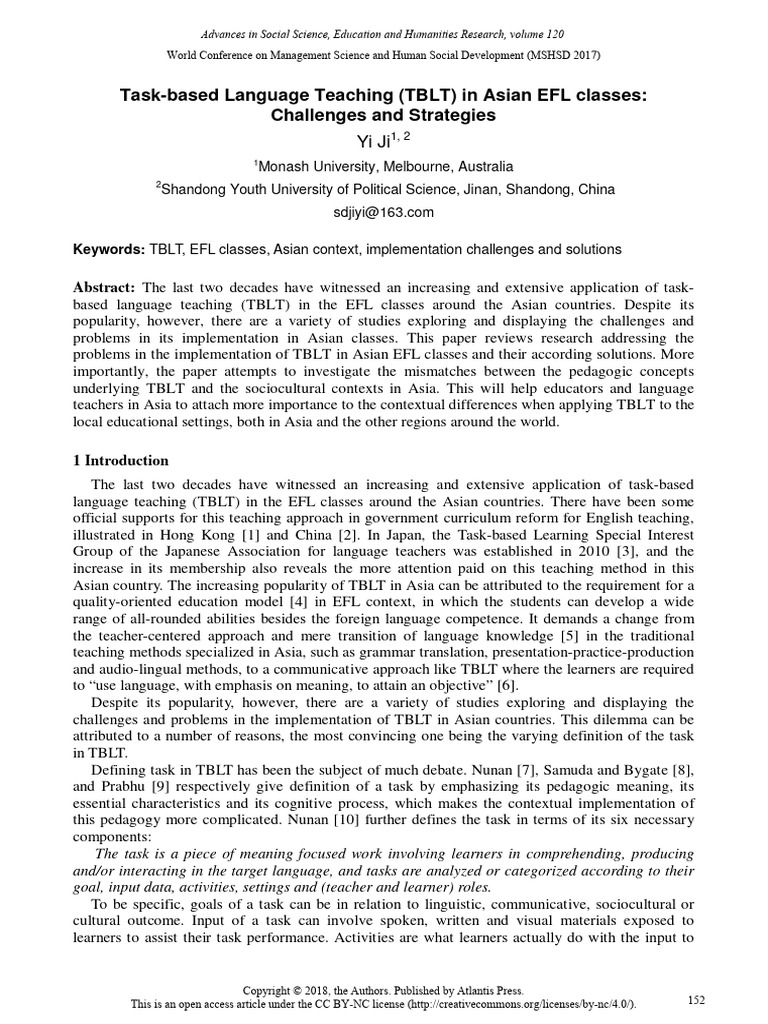 Keywords: TBLT, EFL classes, Asian context, implementation challenges and solutions