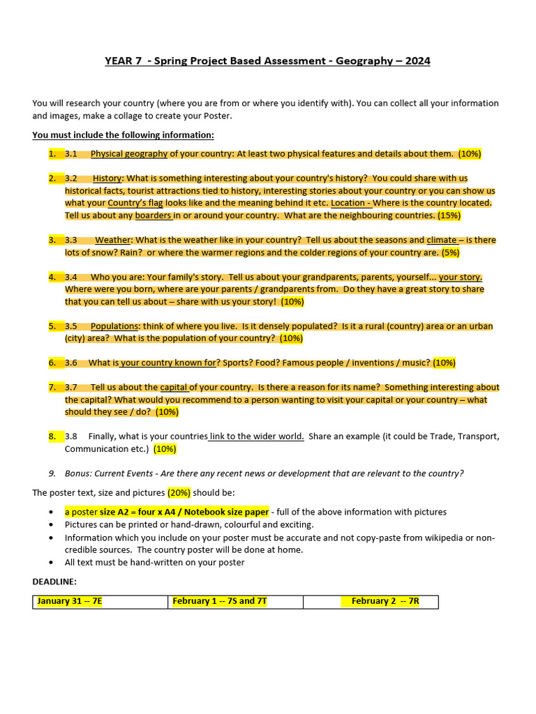 YEAR 7 - Spring Project Based Assessment - Geography – 2024