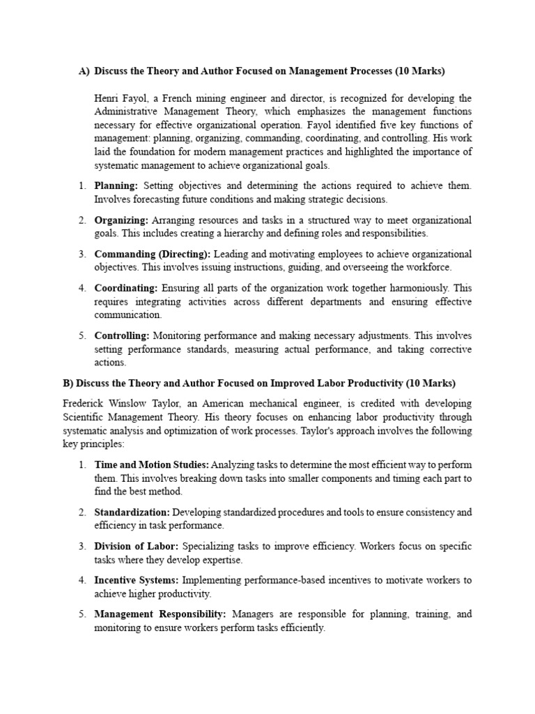 A) Discuss the Theory and Author Focused on Management Processes (10 Marks)