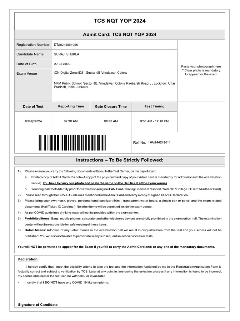 this Admit Card) and show the same to the Security Guard at the entry into the exam venue.