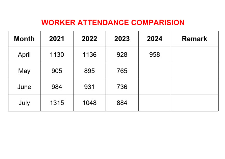 The document compares worker attendance numbers for months in 2021, 2022, 2023 and 2024, showing attendance was highest in 2021 and generally declined each subsequent year, with the lowest numbers in 2023.