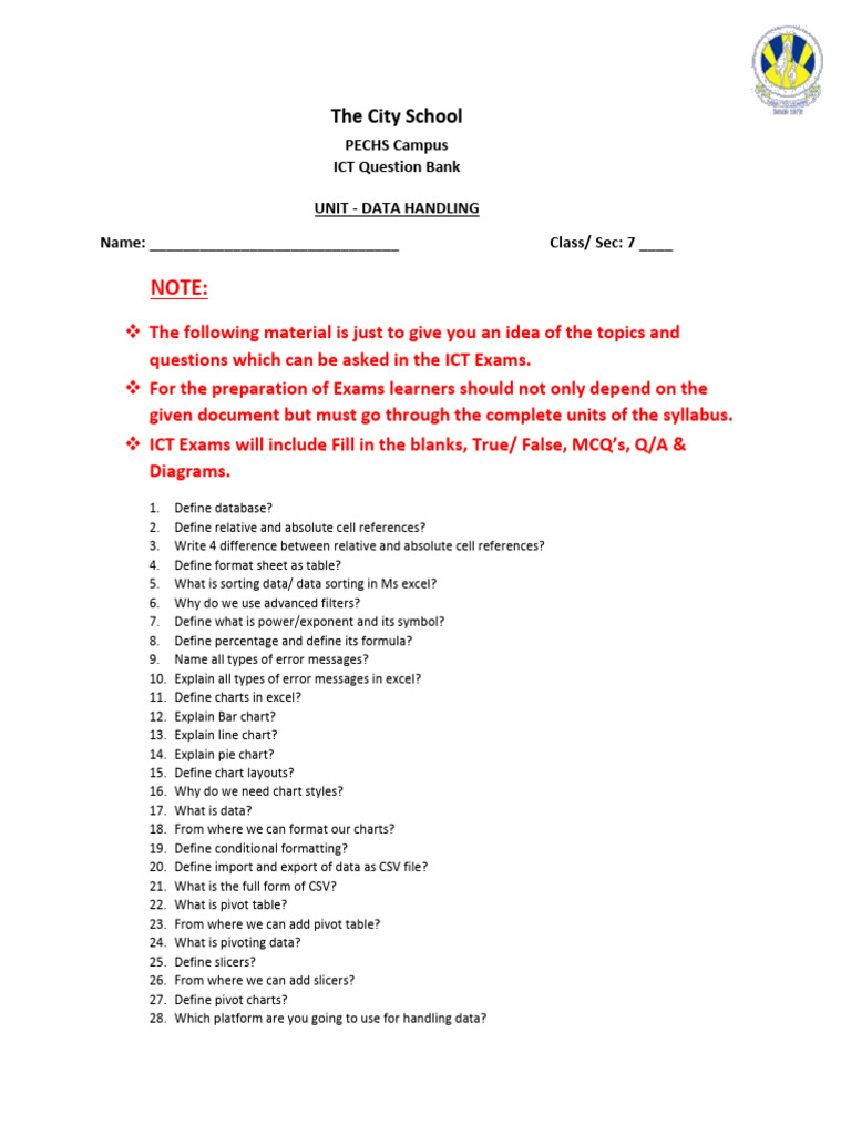 ICT Exams will include Fill in the blanks, True/ False, MCQ’s, Q/A &