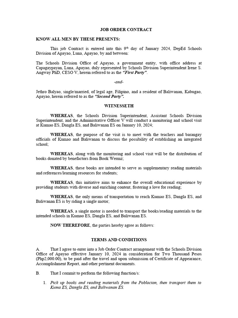 This job Contract is entered into this 9 th day of January 2024, DepEd Schools