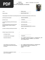 I, Shri/Smt./Kumari....Son/wife/ Daughter of ..hereby apply for the renewal of my driving licence which is attached and particulars of which are as follows:(a) (b) (c) (d) Number Date of Issue Licensing authority by which the licence was issued Licensing authority by which the Licence was last renewed No. and dated of renewal (e) (f) Class of vehicles authorized to be driven Date of expiry of licence to drive Transport vehicle Vehicles other than transport vehicles My present address is . . . .. . .. ..