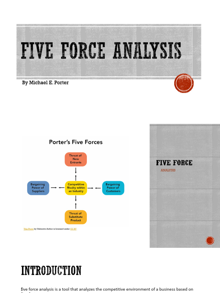 five force analysis is a tool that analyzes the competitive environment of a business based on