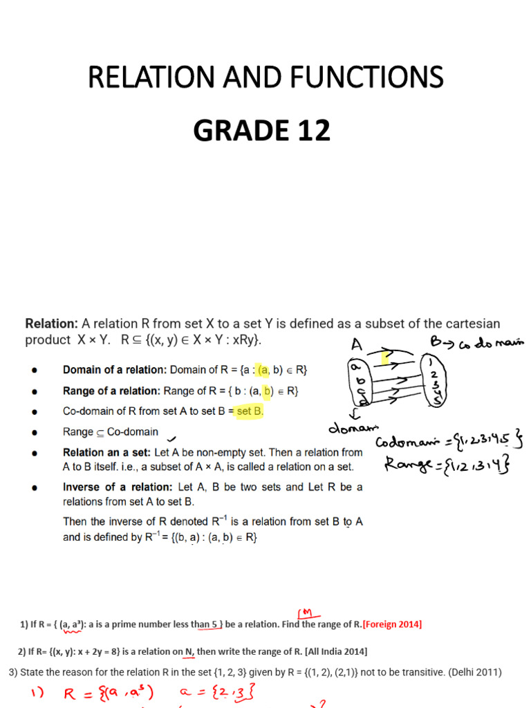 1) If R = { (a, a³): a is a prime number less than 5 } be a relation. Find the range of R.[Foreign 2014]