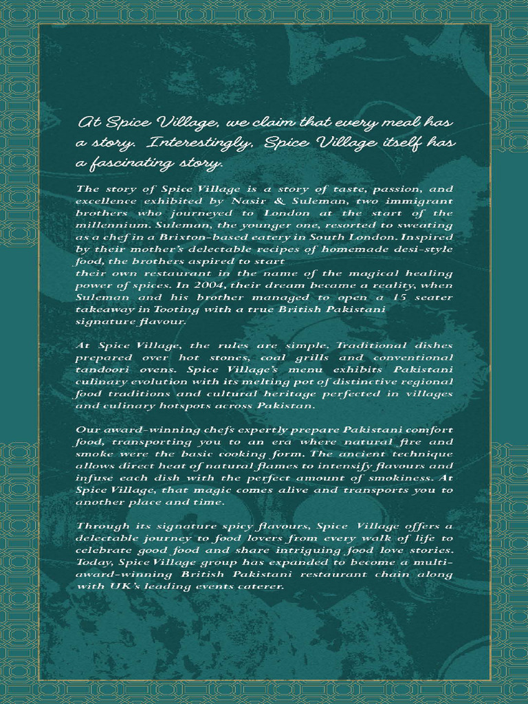 tandoori ovens. Spice Village’s menu exhibits Pakistani